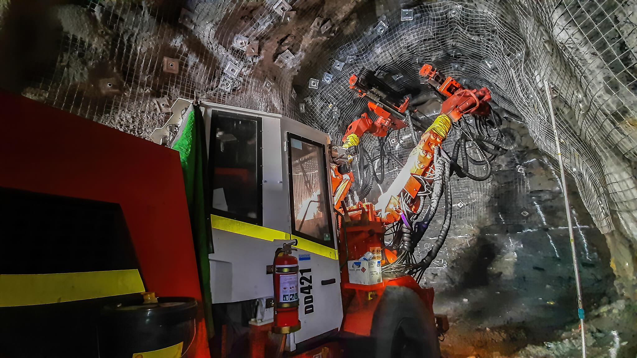 Unlike Open Pit mining, Underground mining tunnels need extensive support to hold the surrounding ground safely. To secure the tunnel walls and ceiling, a concrete material called shotcrete is sprayed before sheets of steel mesh are bolted overtop.